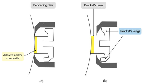The literature describes two debonding techniques: the wing approach and the base method (Figure 1). The wing approach involves gripping the mesial and distal wings of the bracket using forceps, whereas the base method requires inserting the forceps between the bracket’s base and the tooth surface. Brosh’s latest research indicates an overlap between these two debonding procedures [37].