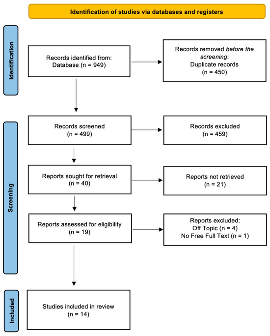 A total of 949 papers were found in the online databases (Web of Science n = 282, PubMed n = 337, and Scopus n = 329) using the Boolean keywords “enamel” AND “orthodontic debonding” as the search string; After removing 450 duplicates, 499 studies were taken into consideration by reading the title and abstract, focusing on the different techniques and the variation in enamel structure after the debonding procedure. This analysis led to the selection of 40 records out of 499 papers, whereas 459 articles were excluded for different reasons (229 off topic, 20 reviews, 150 in vitro, 20 on animals). Subsequently, 21 non-retrieved records were excluded because texts were not available. After reading the full texts of the remaining 19 reports eligible, 5 more reports were excluded (1 was not free and 4 were off topic). Finally, 14 papers were chosen for the systematic review. Figure 2 summarizes the selection procedure. The study data were selected by analyzing the study design, patients, type of intervention, and outcomes (Table 2).