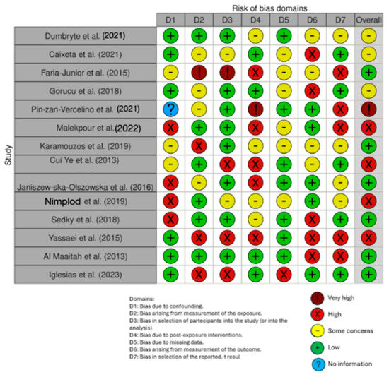 Evaluation of bias by ROBINS: Dumbryte et al. (2021) [48]; Caixeta et al. (2021) [49]; Faria-Junior et al. (2015) [50]; Gorucu et al. (2018) [51]; Pin-zan-Vercelino et al. (2021) [52]; Malekpour et al. (2022) [53]; Karamouzos et al (2019) [54]; Cui Ye et al. (2013) [55]; Janiszew-ska-Olszowska et al. (2016) [56]; Nimplod et al (2019) [57]; Sedky et al (2018) [58]; Yassaei et al. (2015) [59]; Al Maaitah et al. (2013) [60]; Iglesias et al. (2023) [61].
