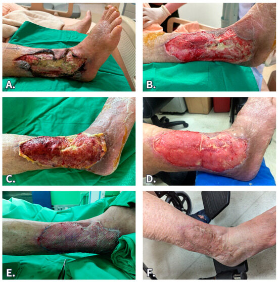 A 61-year-old man had diabetes and peripheral artery disease. (A) He suffered from right foot necrotizing soft tissue infection resulting in a wound with bone and tendon exposure. (B,C) He underwent BTM grafting but wound infection occurred. The silicone sheet was removed at 3 weeks after implantation. (D,E) After wound care and antibiotic treatment, the wound infection was resolved, and most of the neodermis survived. STSG surgery was then conducted. (F) Three months post STSG.