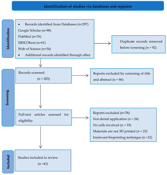A comprehensive literature search encompassing publications from 2018 to April 2024 was conducted across four databases: Google Scholar, PubMed, EBSCOhost, and Web of Science. The search strategy incorporated the following terms: (“3D bioprinting” OR “3D-bioprint*” OR “3D print*” OR “Bioprinting” OR “Three-dimensional bioprint*”) AND (“salivary gland” OR “salivary glands”) AND (“Tissue regeneration” OR “Bioengineering”) AND (“Dental” OR “Dentistry”). Additionally, supplementary records were identified through the manual scrutiny of reference lists.