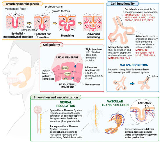 Designing the tissue construct with the appropriate structural features is essential for mimicking the complexity of native salivary glands. This includes replicating the hierarchical organization of acini, ducts, and blood vessels within the glandular tissue. The anatomical and structural features of salivatory glands are illustrated in Figure 3 [18]: