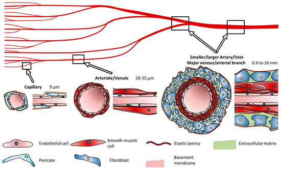 The number of layers and their thickness within blood vessels depends on their physiological function. Capillaries, with a diameter of approximately 9 µm, consist of a single layer of endothelial cells (ECs) surrounded by pericytes, facilitating rapid and efficient oxygen and nutrient diffusion. Arteries, with a diameter ranging from 0.6 to 16 mm, possess thick, flexible walls capable of withstanding high pressures and accommodating continuous diameter changes. Conversely, veins, with a diameter ranging from 1 to 15 mm, sustain lower blood pressures and exhibit thinner walls lacking the distinct structural organization seen in arteries, Figure 4 [49].
