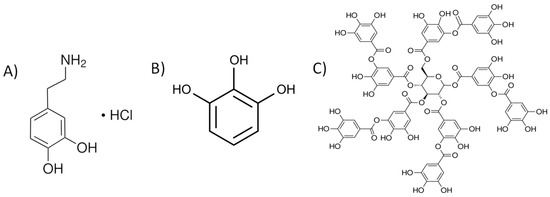 Structures of phenolic compounds used in this research: (A) dopamine hydrochloride, (B) pyrogallol, and (C) tannic acid.