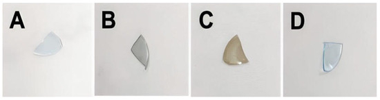 Using a cutter blade, the contact lens was divided into four pieces, and each resulting piece underwent dip-coating in a phenolic solution (Figure 3). Subsequently, distinct changes in coloration were observed in the segments coated with PDA and PPG. Interestingly, the transparency of the contact lens coated with PTA was comparable to the bare lens.