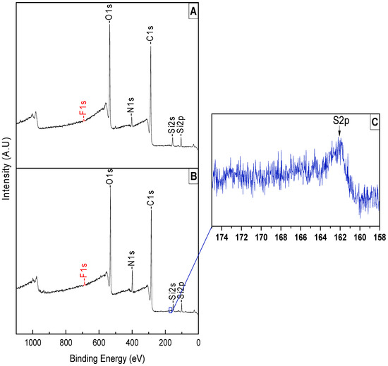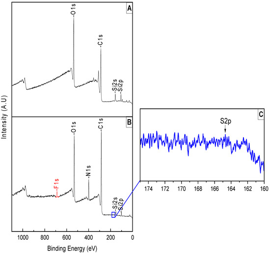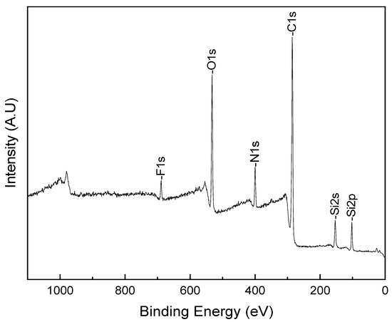The XPS spectrum (Figure 4) demonstrates the chemical elements present in our bare substrate: C1s (carbon), N1s (nitrogen), O1s (oxygen), Si2s, Si2p (silicon), and F1s (fluorine). The intensity of the peaks informs us of quantitative information and the appearance of the elements present in the substrate. As fluorine is more exposed to the surface compared to silicone and nitrogen, this is the reason why the F peak is our reference for the coating.