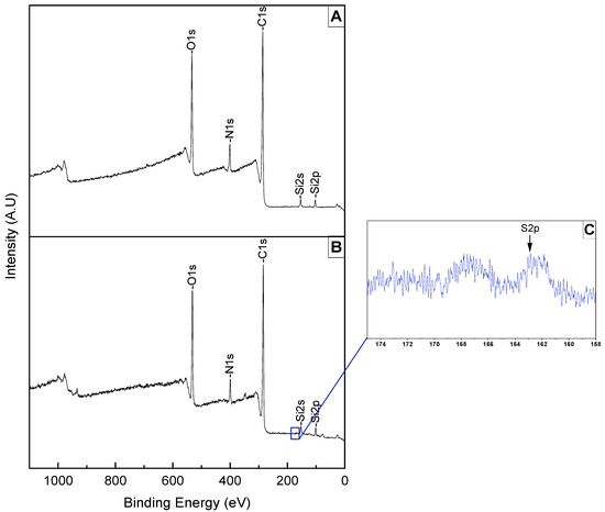 Survey peaks of (A) PDA coating on an RPG lens, (B) peptoid grafting, and (C) high-resolution S2p peak.