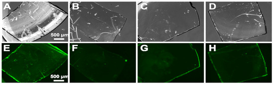 Optical (A–D) and fluorescence (E–H) images of each lens after FITC-albumin adsorption on (A,E) Bare substrate; (B,F) PDA/peptoid-coated substrate; (C,G) PPG/peptoid-coated substrate; (D,H) PTA/peptoid-coated substrate.