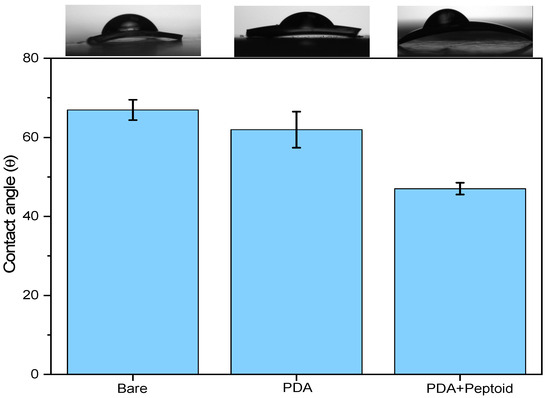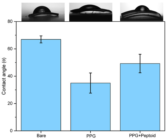 Hydrophilicity was increased after the PPG coating at 35 ± 7.4° (Figure 11), compared to the PDA coating. This is due to the relatively high portion of oxygenated groups inside the molecular structure of pyrogallol (Figure 1C). After the peptoid grafting, the contact angle was increased to 49. 3 ± 6.8°, which is comparable to the value of the peptoid-grafted PDA surface. This indicates that the peptoid grafting was also successful on the PPG coating, even though we could not observe a strong peptoid signal (S2p) from the XPS results (Figure 6C).