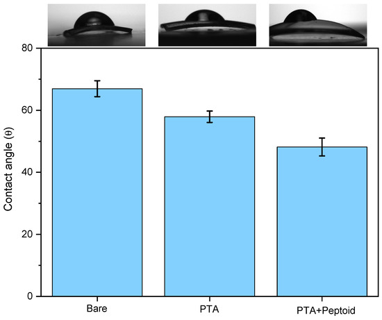 Variation of water contact angles: on the bare contact lens, PTA coating on the bare contact lens, and peptoid grafting on the PTA.