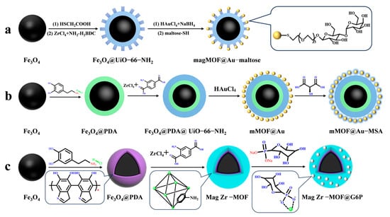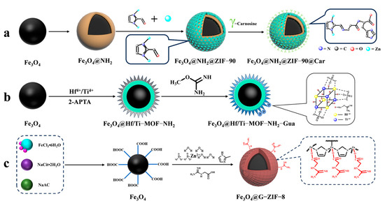 - Ke, F.; Qiu, L.-G.; Yuan, Y.-P.; Jiang, X.; Zhu, J.-F. Fe3O4@MOF core–shell magnetic microspheres with a designable metal–organic framework shell. J. Mater. Chem. 2012, 22, 9497. [Google Scholar] [CrossRef]