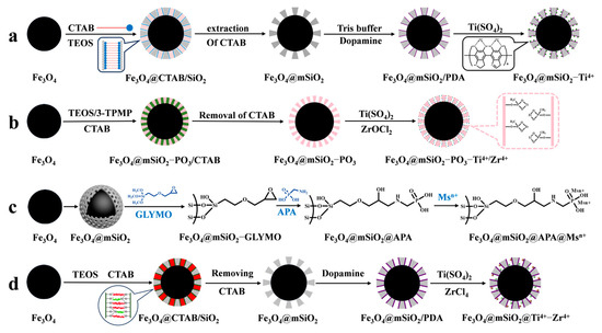 - Li, Y.; Liu, L.; Wu, H.; Deng, C. Magnetic mesoporous silica nanocomposites with binary metal oxides core-shell structure for the selective enrichment of endogenous phosphopeptides from human saliva. Anal. Chim. Acta 2019, 1079, 111–119. [Google Scholar] [CrossRef]