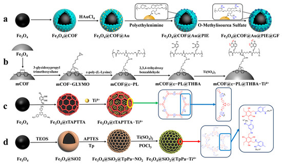 - Meng, L.; Wang, B.; Wang, B.; Feng, Q.; Zhang, S.; Xiong, Z.; Zhang, S.; Cai, T.; Ding, C.-F.; Yan, Y. Post-synthesis of a titanium-rich magnetic COF nanocomposite with flexible branched polymers for efficient enrichment of phosphopeptides from human saliva and serum. Analyst 2023, 148, 4738–4745. [Google Scholar] [CrossRef] [PubMed]