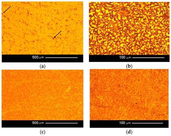 Microstructures of the tested samples: (a) cast sample; image plane parallel to rod axis (100× magnification); (b) cast sample; image plane perpendicular to rod axis (500× magnification); (c) SLM sample; image plane parallel to rod axis (100× magnification); (d) SLM sample; image plane perpendicular to rod axis (500× magnification). Example pores are marked with arrows.