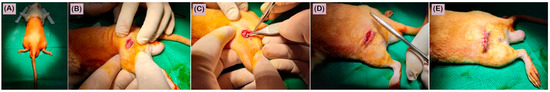 Operative steps for the surgical method: (A) positioning of rats on the operating table in sternoabdominal position; (B) skin incision; (C) implantation of the alloy fragment in contact with the bone tissue; (D) the muscle layer was sutured in a continuous thread; (E)the skin was sutured in separate points.