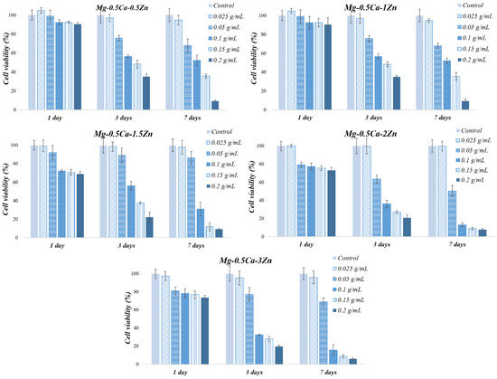 MG-63 cell viability results at 1, 3, and 7 days of contact with different alloy extraction ratios.