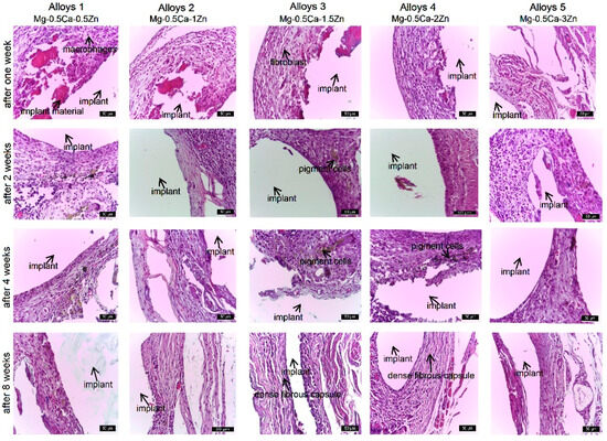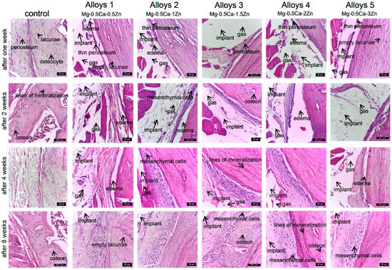 Histological staging of material precursors at the implant site at the first, second, fourth, and eighth weeks post-implantation was as follows: At the first week, there were reduced connective tissues, a partially resorbed area of implant material surrounded by peripheral fibrotic reactions, and a moderate inflammatory reaction including macrophages, fibroblasts, and collagen fibers. After the second week, there were low absorption of implant material and gas release, moderate inflammatory reaction around implant material, presence of collagen fibers (young connective tissue), and newly formed capillaries. In weeks four and eight after implant placement, significant resorption of the implanted material was accompanied by a reduction in gas release, visualized as hollow spaces surrounded by periosteum and bone and connective tissue around the implant. Gas release was proportional to the absorption rate of the alloy; after eight weeks, the connective tissue at the implant site was well organized, replacing the absorbed implant material. In vivo studies of magnesium-based alloys with different Zn concentrations showed very good histocompatibility and tissue resorption after eight weeks. Sparse, short, and discontinuous interlamellar areas two weeks after implant placement reflect gradual recovery of the periosteum, discontinuous matrix deposition associated with desynchronized osteoblast synthesis [31], and reduced deposition rates [32]. In lamellar bone, four weeks after implant placement, mineralization lines were observed as dark stripes between bone lamellae, which are said to represent areas of low matrix density [33] or reduced collagen fiber organization [34]. These changes highlight that implants caused destruction of periosteum and periosteal bone within the first four weeks. Four to eight weeks after implant placement, the bone tissue was better organized and characterized by evenly oriented mineralization lines over long distances.