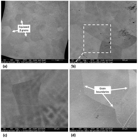 SEM micrographs of Ti-33Nb-3Ga alloy at various magnifications of (a) 50×, (b) 200×, (c) 267×, and (d) 500× showing distinct β-phase grains.