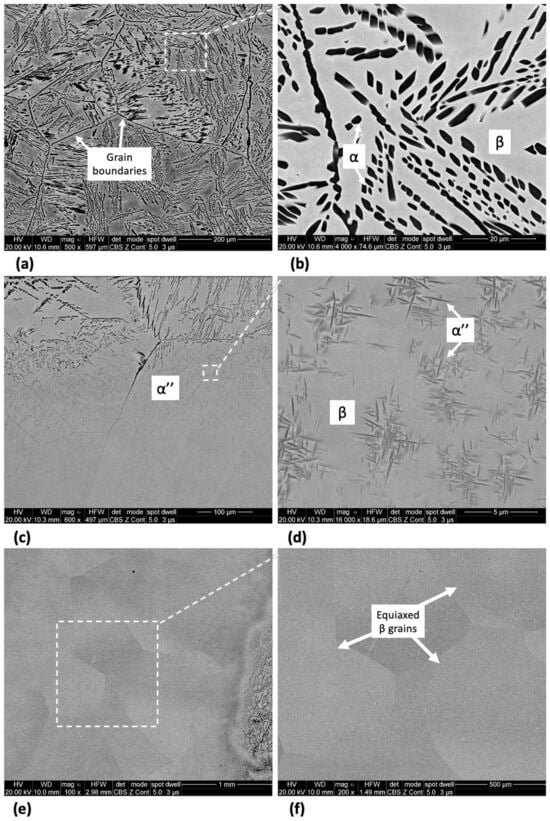 SEM micrographs of Ti-33Nb-5Ga alloy at various magnifications showing dendritic α-phase colonies (a,b), transformed martensitic phase (c,d), and equiaxed β-phase grains (e,f).