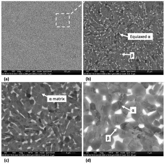 SEM micrographs of the Ti-6Al-4V alloy at magnifications of (a) 1000×, (b) 5000×, (c) 10,000×, and (d) 20,000× showing alpha equiaxed grains with minor β-phase grains.