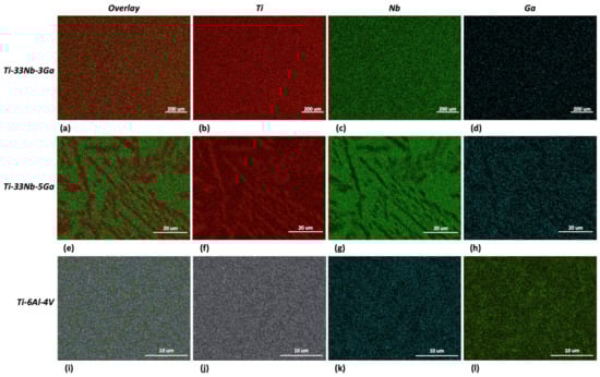 EDS mapping for: (a–d) Ti-33Nb-3Ga, (e–h) Ti-33Nb-5Ga, and (i–l) Ti-6Al-4V.