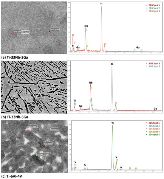 EDS spectrum analysis of the alloy samples indicating chemical composition of microstructural features and the overall alloy for: (a) Ti-33Nb-3Ga, (b) Ti-33Nb-5Ga, and (c) Ti-6Al-4V.