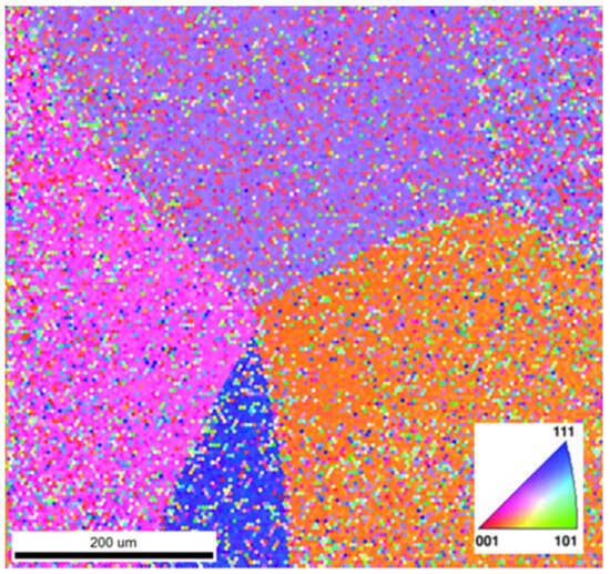 Electron backscatter diffraction (EBSD) and inverse pole figure (IPF) mapping of the β-phase grain structure, as exhibited for both the Ga-containing alloys, reveal the various orientations of the β phase crystal lattice, as shown in the IPF mapping of Ti-33Nb-3Ga in Figure 7. Congregations of colour are indicative of the same lattice planes in crystal lattices, where the Miller indices of the pink, purple, orange, and blue assemblies correspond to 011, 101, 110, and 102 planes in the cubic crystal, respectively. This indicates that the β-phase grains do not differ elementally, also confirmed by EDS in Figure 6a, and instead vary by the differing orientations of their crystal structure.