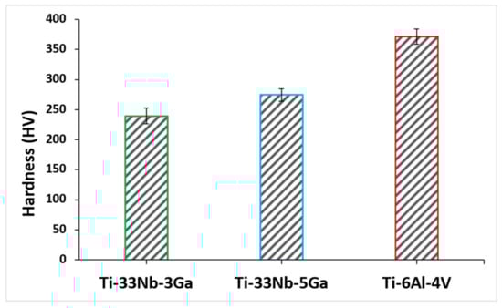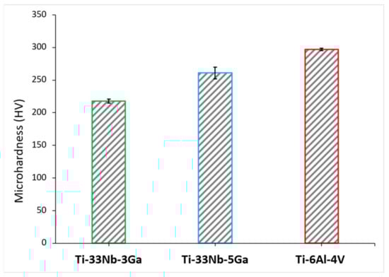 The variation in Vickers microhardness as a function of increasing gallium content (wt%) compared to the reference material is depicted in Figure 8, with values obtained for Ti-33Nb-3Ga, Ti-33Nb-5Ga, and Ti-6Al-4V being 218.0 ± 2.9, 260.9 ± 9.2, and 297.0 ± 1.9 HV, respectively. Increasing elemental concentrations of gallium from 3 to 5 wt% resulted in an approximate 20% increase in microhardness, indicating a possible strengthening effect from gallium addition. The microhardness result for Ti-6Al-4V is in accordance with values reported in the literature [30,31].