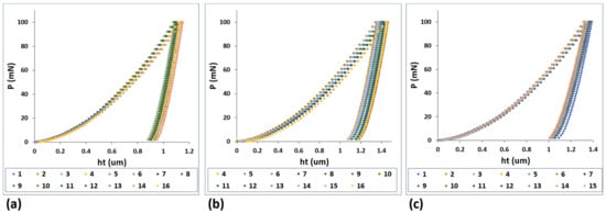 Load-displacement curves from nanoindentation results for: (a) Ti-33Nb-3Ga, (b) Ti-33Nb-5Ga, and (c) Ti-6Al-4V.