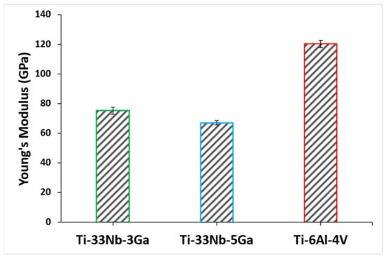 The Young’s modulus results for the developed Ga-containing alloys together with the reference alloy are depicted in Figure 10, where the mean results and standard deviation are also reported in Table 3. The Young’s modulus of Ti-33Nb-3Ga and Ti-33Nb-5Ga were found as 75.4 ± 2.4 GPa and 67.2 ± 1.6 GPa, respectively. The measured Young’s modulus result for Ti-6Al-4V was 120.5 ± 2.3 GPa, which is in close agreement with reported values in the literature [32,33]. The addition of higher gallium concentrations from 3 to 5 wt% to the Ti-33Nb matrix led to a favourable decrease in the Young’s modulus by 11%. Notably, both of the developed alloys were found to have a significantly reduced Young’s modulus compared to the reference alloy, where the Young’s modulus for the 3 wt% Ga sample was 37% less than Ti-6Al-4V, and the 5 wt% Ga alloy was lowered as much as 44% compared to the reference alloy.