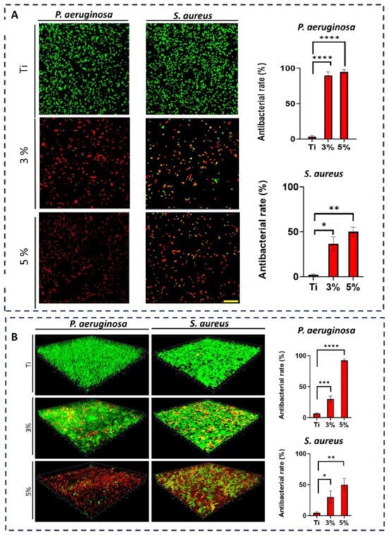 Ti-6Al-4V (labelled Ti), Ti-33Nb-3Ga (labelled 3%), and Ti-33Nb-5Ga (labelled 5%) antibacterial activities against Gram-negative Pseudomonas aeruginosa (P. aeruginosa) and Gram-positive Staphylococcus aureus (S. aureus). CLSM pictures and associated plots assessing the antibacterial efficiency of Ti, 3%, and 5% against P. aeruginosa and S. aureus for 6 h (A) and 24 h (B). Dead bacteria are red, while living bacteria are green. The scale bar measures 20 µm. n = 3 ± SD. * p < 0.1, ** p < 0.01, *** p < 0.001, **** p < 0.0001.