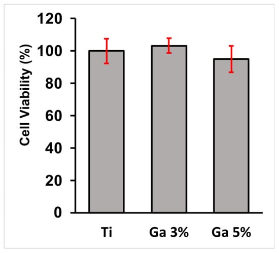 The cell viability of the hGF cells cultivated onto the surfaces of the Ti-33Nb-3Ga and Ti-33Nb-5Ga alloys, together with the control Ti-6Al-4V, are depicted in Figure 13 and in Table 4. The cell viability for the control group (Ti-6Al-4V) was normalised and compared to that of the 3 wt% and 5 wt% Ga samples, reported at 103.1 ± 4.6% and 94.9 ± 8.2%, respectively. Among the tested alloys, there is no significant difference when comparing the cell viability obtained by the Ti-33Nb-3Ga and Ti-33Nb-5Ga alloy specimens to the control surface (Ti-6Al-4V) (p < 0.05). Therefore, high cell proliferation and no cytotoxicity was observed on hGF cells in direct contact with the specimens over 24 h.