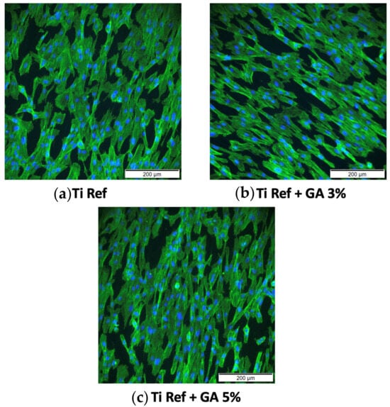 Fluorescence images of the cell morphology and cytoskeleton distribution on the surface of the titanium samples are depicted in Figure 14. Images depict staining of actin cytoskeleton and nucleus with FITC conjugated phalloidin (green) and DAPI (blue), respectively. Cells directly exposed to alloys depict a healthy, typical morphology with a prominent nucleus, elongated fibroblastic spindle-shaped morphology, and F-actin filamentous stress fibres in a well-organised and defined structure of parallel bundles along the cellular axis. No significant difference was observable between Ti-33Nb-xGa specimens to the cytoskeleton distribution and cell morphology on the surface of the Ti-6Al-4V control. In addition, the cytoskeleton organisation is not affected by increasing elemental additions of gallium to the master alloy, evidenced by an absence of changed cell morphology and the lack of filament condensing. These results corroborate with the assay results in Figure 13 and Table 4. Images of stained cells in Figure 14 therefore clearly suggest the presence of healthy cells for the F-actin cytoskeleton and nucleus, indicating that the surfaces of the alloys are not cytotoxic.