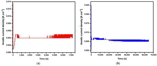 Based on the shape of the obtained current–time characteristics for the CpTi G4 under the proposed electrochemical oxidation conditions, one can notice the repeatability of the course of the obtained curves shown in Figure 2a–d. Electrochemical noise is also visible, resulting from the semiconductive properties of the oxide layers formed on the surface of the CpTi G4 substrate. At the beginning part of each curve, there is a sudden drop in the anodic current density from the initial values in the range of 0.014 to 0.040 A cm−2 to values close to 0 A cm−2 (stage 1), after which the anodic current density increases to a value oscillating around 0.005 A cm−2 (stage 2). Then, a plateau is observed, the length of which increases with the anodizing time, which ranges from 2 to 48 h (stage 3). This nature of changes in the anodic current density as a function of time during the electrochemical oxidation of CpTi G4 proves the multi-stage process of creating a porous oxide layer [21,22,23].