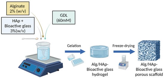 Representation of the composite scaffold preparation process. Alginate (Alg) hydrogel containing hydroxyapatite (HAp) and bioactive glass is prepared through a slow gelation method using glucono-delta-lactone (GDL); the hydrogel is then freeze-dried to obtain the porous scaffold. Created with biorender.com, accessed on 5 February 2024.