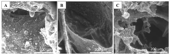 The morphological characterization of the scaffolds was performed using Environmental Scanning Electron Microscopy (eSEM) to characterize the biomaterial surface and to analyze the effects of BGMS10 addition on the alginate structure. eSEM imaging was performed on scaffold cross sections (Figure 2) to evaluate possible differences in structure between Ctrl-sc (A), BG6-sc (B), and BG12-sc (C) samples. At the microscopic level, the scaffold obtained after adding the bioactive glass (BG) maintained a rough surface due to the mineral component, similar to the Ctrl-sc. The figures (Figure 2) demonstrate that Alg/HAp-BGMS10 scaffolds display smooth areas through the interconnected cavities due to the presence of BG.