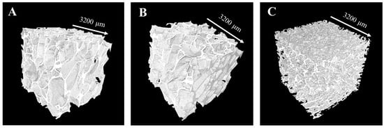 Three-dimensional reconstructions of Ctrl-sc (A), BG6-sc (B), and BG12-sc (C) determined with microcomputed tomography. Differences between in the porosity and pore distribution of BG12-sc with respect to Ctrl-sc and BG6-sc can be appreciated.