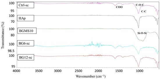 ATR-FTIR spectra of BG-sc compared with Ctrl-sc, pure BGMS10, and pure HAp powder; the spectra do not show any chemical alteration in scaffold composition.