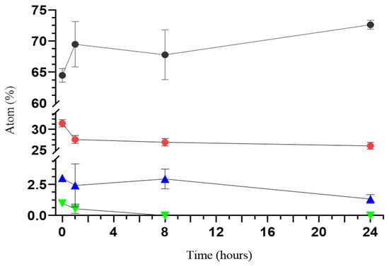 Concentrations (expressed as atomic percentages) of calcium (●), phosphorus (●), silicon (▲), and magnesium (▼) in BG6-sc after immersion in PBS for up to 24 h analyzed by microanalysis; slight decreases and releases of P, Mg, and Si are observable.