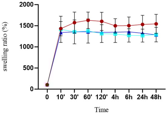 Ctrl-sc, BG6-sc, and BG12-sc (N = 12) were weighed and immersed in 4 mL of PBS in a 12-well plate at 37 °C. At the selected time points (10 min, 30 min, 1 h, 2 h, 4 h, and 24 h), the scaffolds were gently removed from the PBS and placed on 8 layers of blotting paper for 10 s to remove excess PBS. Scaffolds were then weighed, and weight variation was calculated according to Equation (1):