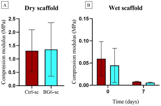 Uniaxial compression tests performed on dry and wet scaffolds were used to test their mechanical behavior. Evaluations of elastic modulus (E) and ultimate compressive strength (σucs) show that Ctrl-sc and BG6-sc exhibit similar properties in terms of elastic modulus and ultimate compressive strength in the dry state. This suggests that adding 0.3% BGMS10 does not have an effect on the mechanical properties of the alginate/HAp scaffolds. As reported in Table 3, wet scaffolds exhibited lower mechanical resistance than the dry ones. As depicted in Figure 8, soaking in PBS causes a significant decrease in compressive modulus and ultimate compressive strength over a period of one week, resulting in weak mechanical resistance.