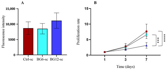 Cell adhesion was evaluated 24 h after seeding, and no remarkable differences were detected (Figure 9A). Cells grown in a multiwell plate were used as controls for both types of scaffolds, and the fluorescence was normalized on day 1 to calculate the proliferation rate over time. The proliferation rates (Figure 9B) on BG6-sc and Ctrl-sc were comparable, although the microporosity of BG6-sc was slightly lower, as shown in the structural characterization. However, cell viability on BG12-sc was significantly reduced between day 3 and day 7 compared to BG6-sc and Ctrl-sc. This result could be attributed to the reduced porosity, which does not allow for cell proliferation within the scaffold, rather than lower material compatibility. Nevertheless, none of the scaffolds exhibited any cytotoxic effect towards the MG-63 cell line.