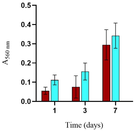 A tetrazolium salt test (MTT) (Merck, St. Louis, MI, USA) was used to evaluate cell metabolic activity. At the selected time point, a solution of MTT diluted 1:5 in high-glucose DMEM (700 µL per scaffold) was added and incubated for 4 h at 37 °C under 5% CO2 in the dark. Purple formazan was eluted in 2 mL dimethyl sulfoxide (DMSO) for 30 min at room temperature. Samples were cut into four parts and squeezed using a tip to allow for better dissolution of Formazan’s crystal into the scaffold. Subsequently, the supernatant was collected in a test tube and centrifuged to eliminate scaffold residues that could interfere with the absorbance signal. At the end, 200 μL was transferred in a transparent 96-well plate, and absorbance (OD = 560 nm) was measured by a spectrophotometer. The absorbance of the formed formazan product was directly proportional to the living cells on the porous scaffold. Cell-free scaffolds were used as blanks. The entire experiment was incubated for 1, 3, 7, and 10 days after seeding to study the proliferation of the cells.