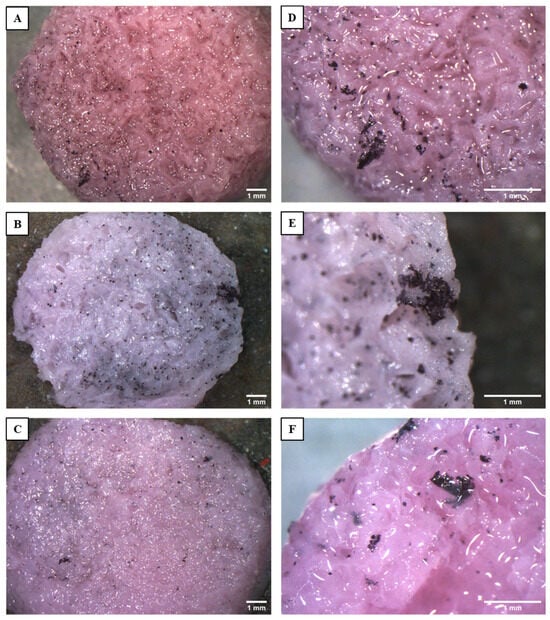 Top views of Ctrl-sc (A,D), BG6-sc (B,E), and BG12-sc (C,F) captured by stereoscope imaging at two different magnifications. The black spots correspond to cells and cell clusters, which metabolized the MTT dye. The higher level of cell colonization on BG6-sc is clearly visible.