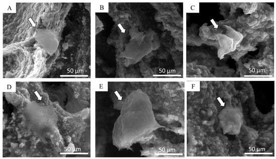 eSEM micrographs of MG-63 cells (indicated by arrows) seeded on Ctrl-sc (A), BG6-sc (B), and BG12-sc (C) on day 1. Cells spreading on Ctrl-sc (D), BG6-sc (E), and BG12-sc (F) on day 8. Differences in cell morphology between BG12-sc, BG6-sc, and Ctrl-sc can be appreciated.