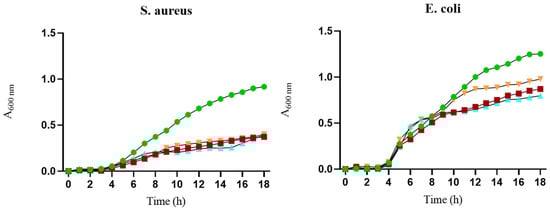 Bacteria were harvested from a glycerol pellet stored at −80 °C and resuspended in 5 mL of Luria–Bertani (LB) broth; the bacterial suspensions were incubated overnight at 37 °C under agitation (140 rpm). The following day, 300 µL of the overnight cultures was re-inoculated in 10 mL of fresh LB broth. Then, bacteria were incubated again at 37 °C and 140 rpm until an optical density of 0.3 600 nm (OD600) was reached (mid.log phase), and the bacterial concentration was evaluated via predictive models, knowing that OD600 = 0.29 corresponds to a bacterial concentration of 1.8 × 108 CFU/mL for S. aureus ATCC 25923 and OD600 = 0.3 corresponds to a bacterial concentration of 1.15 × 108 CFU/mL for E. Coli ATCC 25922.