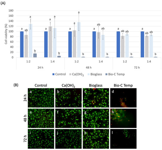 (A) Graph representing the viability results of DPCs determined by an MTT assay. The Ca(OH)2 and 45S5 bioglass groups showed similar cell viability to the control group, with no significant difference among groups in all analysis periods and extracts evaluated (p > 0.05), whereas Bio-C Temp showed high cytotoxicity compared to the other groups (p < 0.05). (B) Representative epifluorescence images from the live/dead assay, where compromised cells were stained red and live cells were stained green, demonstrating cell viability in the control (a,e,i), Ca(OH)2 (b,f,j), and 45S5 bioglass (c,g,k) and Biop-C Temp (d,h,l) at 24 h, 48, and 72 h in the 1:4 dilution.