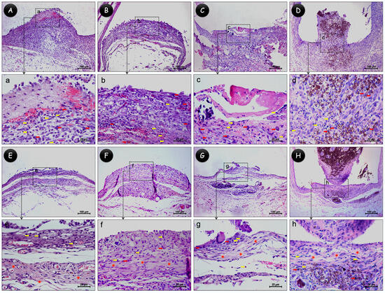 Representative images of inflammatory reaction. (Aa–Dd) At 7 days: (Aa) control, (Bb) Ca(OH)2, (Cc) 45S5 bioglass, and (Dd) Bio-C Temp groups with moderate inflammatory cell infiltration and thick fibrous capsule. (Ee–Hh) At 30 days: (Ee) control, (Ff) Ca(OH)2, (Gg) 45S5 bioglass, and (Hh) Bio-C Temp groups with mild inflammatory cell infiltration and thin fibrous capsule at the tube opening. Yellow arrows indicate lymphocytes; red arrows indicate macrophages; red asterisks indicate collagen fibers; and black lines show the thickness of the fibrous capsules. ((A–H) 100×; (a–h) 400×; hematoxylin–eosin staining).