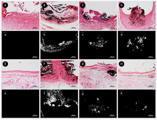 Representative images of biomineralization analysis. Positive structures for von Kossa can be seen in the images as black structures, and positive structures for polarized light are observed as birefringent structures. (A–H) Images of von Kossa and (a–h) polarized light analysis. (Aa–Dd) Day 7 and (Ee–Hh) day 30. (Aa, Ee) Control group with absence of positive structures; (Bb, Ff) Ca(OH)2, (Cc, Gg) 45S5 bioglass, and (Dd, Hh) Bio-C Temp groups with presence of positive structures for both analyses. ((A–H) 100×; von Kossa staining. (a–h) 100×; polarized light visualization).