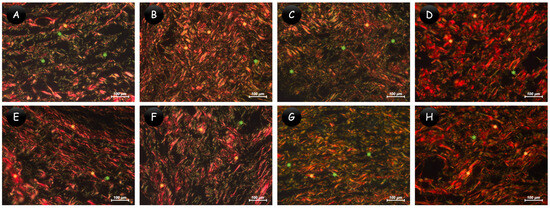 Representative images of collagen maturation. Greenish-yellow fibers are considered immature and thin (green asterisks), while yellowish-red fibers are considered mature and thick (yellow asterisks). (A–D) At 7 days: (A) control and (C) 45S5 bioglass groups showing more immature fibers; (B) Ca(OH)2 and (D) Bio-C Temp groups showing more mature fibers. (E–H) At 30 days: (E) control, (F) Ca(OH)2, and (H) Bio-C Temp groups showing more mature fibers; (G) 45S5 bioglass showing more immature fibers. ((A–H) 400×; picrosirius red staining).